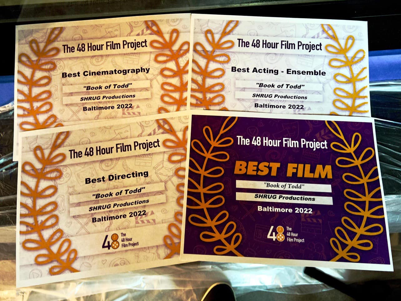 Great news everyone! It’s been a while, but I’m happy to announce my latest film with SHRUG Productions (Book of Todd) just won a number of awards at the Best Of screening last night for the 48 Hour Film Festival in Baltimore! We took home Best Cinematography, Best Director, Best Acting – Ensemble and Best Film! With that, we’ll be moving onto Filmapalooza in Los Angeles next year to represent Baltimore. So proud of everyone who worked on this film with me and I can’t wait to see where else we go from here!